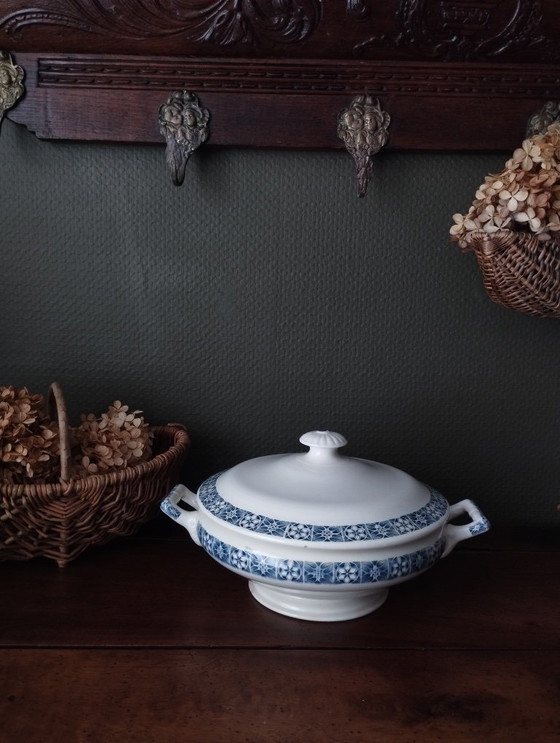Prachtige antieke witte aardewerken terrine, versierd met blauwe friesen, gestempeld door Longchamp, "René"-patroon.