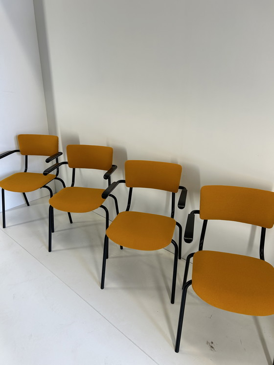 - Vergezeld door vier stoelen, elk nieuw bekleed met een levendig oranje textiel, dat zorgt voor een frisse en moderne touch.