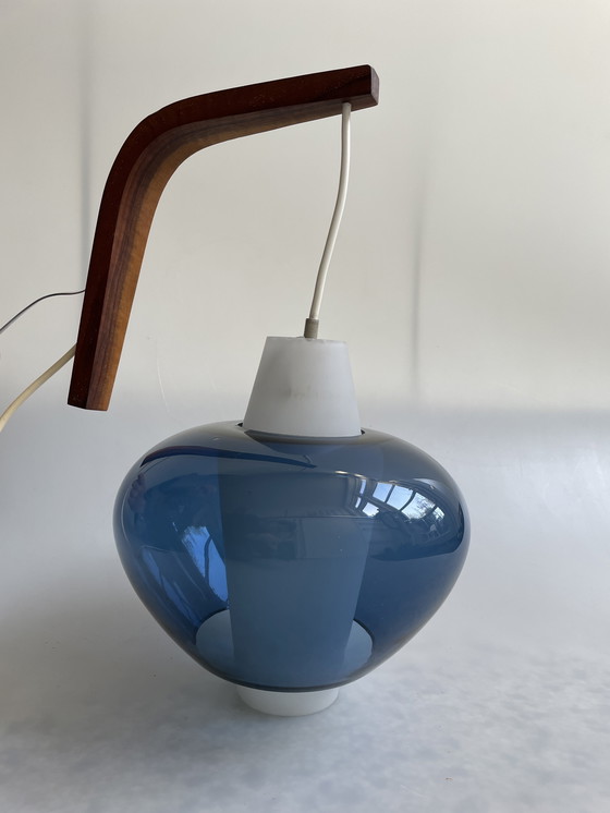Prachtige Louis Kalff wandlamp gemaakt van een transparant blauw geblazen glazen bol, met daarin hangend een mat witte glazen kap waardoor het licht mooi zacht schijnt. De wandbeugek is van hardhout, met een mooie diepbruine kleur.