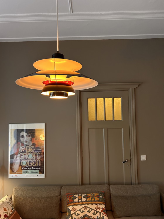 Deze prachtige Louis Poulsen PH50 hanglamp is een speciale editie, geproduceerd in 2010 ter ere van het 50-jarig jubileum van het ontwerp. De lamp heeft een elegante kleurcombinatie van zwart olijf, wit en een Japans rood detail. Het is een originele lamp in nieuwstaat, compleet met de originele doos. Deze lamp is een tijdloos stuk dat elke ruimte een moderne en stijlvolle uitstraling geeft. Ophalen of verzenden is mogelijk.