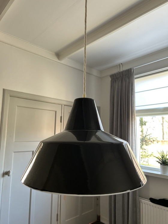De lamp is gemaakt van emaille en heeft een zwarte buitenkant en een wit gelakte binnenkant. De porseleinen fitting en het snoer zijn origineel.
