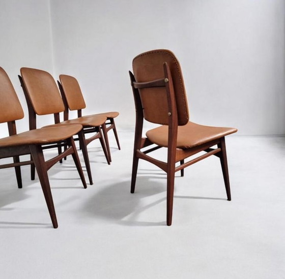 Frame van massief teak met gebogen rugleuningen en messing verbindingen. Originele cognackleurige kunstlederen bekleding, warm tonend bij het hout.