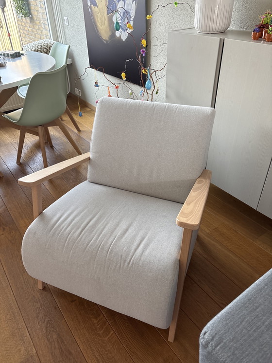 Verrijk uw woonruimte met deze elegante fauteuil, ontworpen voor zowel comfort als stijl. De strakke, moderne uitstraling wordt geaccentueerd door een zachte grijze textielbekleding, die perfect combineert met de natuurlijke warmte van houten armleuningen en poten.