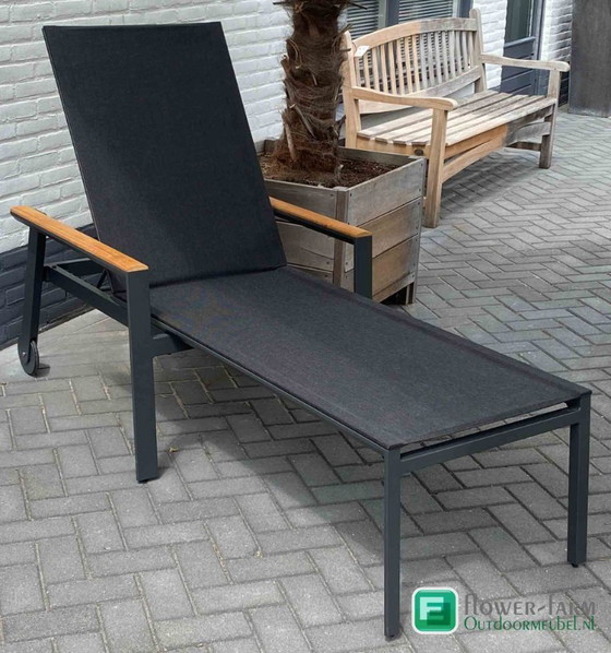 De Solpuri SPA lounger is een modern en comfortabel ligbed met een strak aluminium frame en hoogwaardige textileen bespanning. De verstelbare rugleuning zorgt voor optimaal ligcomfort, terwijl de armleuningen met teak details een warme, luxe uitstraling geven.