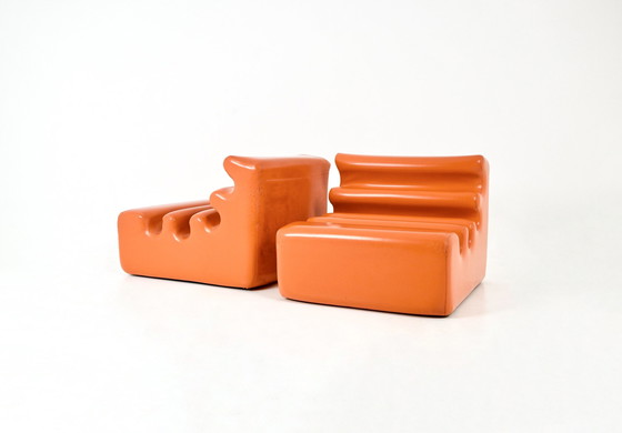 Paar oranje stoelen ontworpen door Liisi Beckmann en geproduceerd door Zanotta in de jaren '60, model Karelia. Zithoogte: 34 cm. Slijtage door tijd en ouderdom.