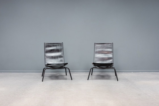 Prachtige set loungestoelen met gekruiste poten in volledig zwarte uitvoering