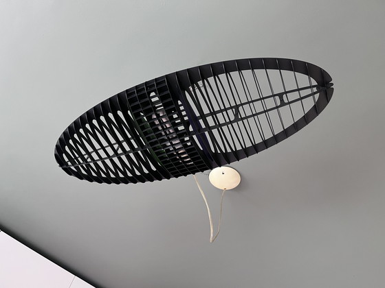 Een designicoon van Luceplan. Titania, ontworpen door Paolo Rizzatto en Alberto Meda in 1989, is een tijdloos, modern en veelzijdig object. Een zwevend volume, slank als een veertje en licht van vorm. Je kunt kiezen hoe je het aankleedt, afhankelijk van je smaak, en het uiterlijk veranderen wanneer je maar wilt. Licht en veelzijdig, door het gebruik van een paar polycarbonaat filters kan deze lamp van kleur veranderen zonder de emissie van wit licht te verstoren. Deze lamp is uitgevoerd met een groene en paarse filter. Het is een vintage exemplaar uit 1989. L:70cm x B:30cm - E27 fitting - lichte gebruikssporen.