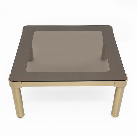 Mid-Century Modern messing salontafel met blad van gerookt spiegelglas van Luciano Frigerio, jaren 70. Deze unieke salontafel is ontworpen door de Italiaanse ontwerper Luciano Frigerio in de jaren 70. Het frame is gemaakt van dik messing, met afgeronde hoeken; het blad is aan de rand van spiegelglas en in het midden gerookt. Het messing is gepolijst.