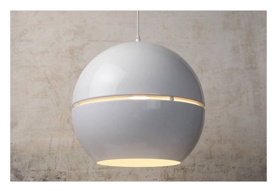 Lucide 70's model hanglamp. Metaal wit gespoten. De twee lamphelften op 1 cm afstand van elkaar, waardoor rondom een interessant projectie op de wanden mogelijk is. Behoorlijk formaat, doorsnede 40 cm. E27 schroef fitting. 50 cm witte stoffen kabel en kunststof plafondkap.