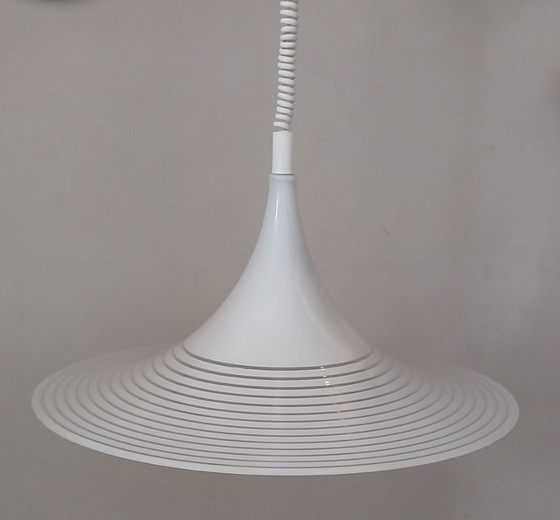 De Guzzini hanglamp is een heksenhoed lamp met een diameter van 57 cm voorzien van concetrishce cirkels