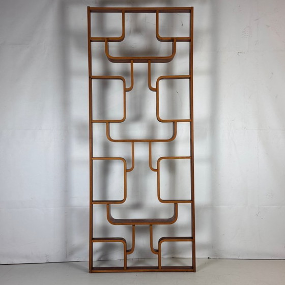 Een opvallende ruimteverdeler uit de Mid Century, ontworpen door Ludvik Volak in de jaren 1960. Dit sculpturale stuk van gebogen hout belichaamt de elegantie van het Tsjechoslowaakse modernistische design. Met zijn organische rondingen en opengewerkte constructie werkt het prachtig als kamerscherm, boekenplank of decoratief pronkstuk.