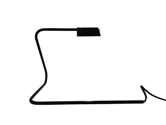 Minimalistische metalen balanslamp "Tablo". De lamp hangt op een tafelblad perfect in balans door het gewicht onderin. Metaal zwart gelakt, kunststof draaibaar kapje met reflector voor halogeenlampje, schakelaar op snoer. Goede gebruikte staat, werkend. Gemerkt Lumiance + typenummer op stekker.