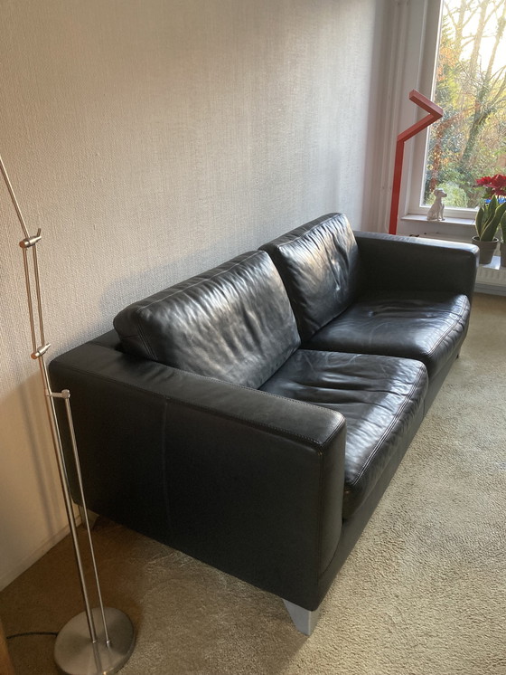 Hoogwaardig zwart leer Saddle 772 Schiefer 25. Type Monolito. 3-zits bank met matchrome poten.Design bank gekocht in 2012 bij Mobi Design Alkmaar. Eerste eigenaar, geen huisdieren en niet gerookt. 1e aankoopnota aanwezig. Wegens kleiner wonen te koop.
