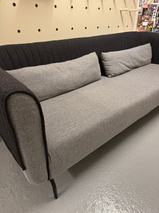 Een stijlvolle design bank van MADE.com in grijze stof met zwarte accenten. De bank is van hoogwaardige kwaliteit en verkeert in zo goed als nieuwstaat. Bijzonder tweekleurig design en limited edition, echt een eyecatcher in een woonkamer of mooi kantoor.