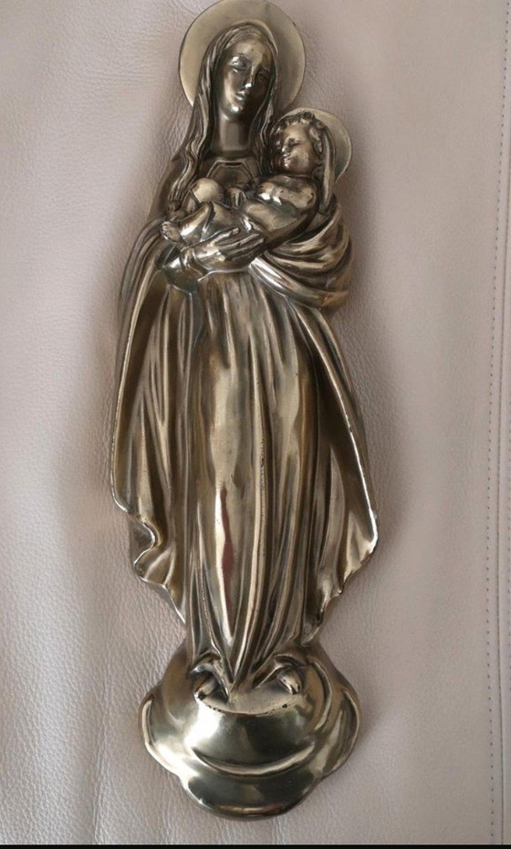 Dit wandreliëf verbeeldt de Madonna met Kind Jezus en is gemaakt van hoogwaardig messing. Het maakt indruk met zijn klassieke afbeelding en de fijne details die het religieuze tafereel tot leven brengen. Ideaal als decoratief element voor je huis of als bijzonder cadeau.