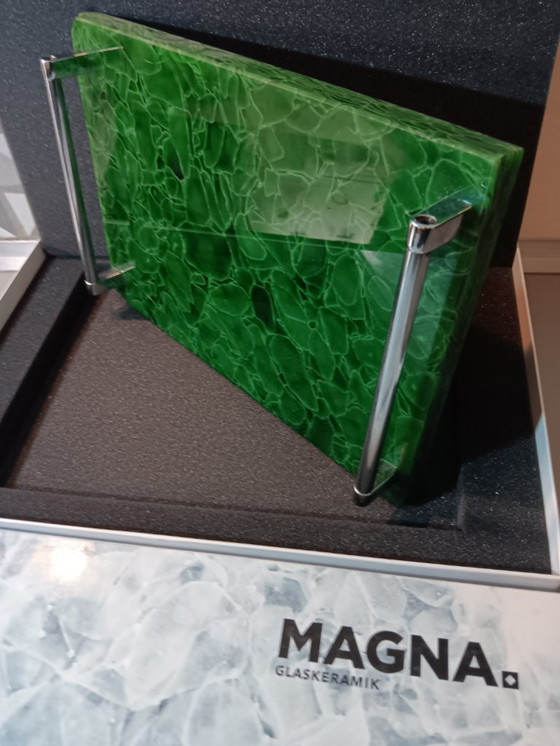 Magna is een merk van eersteklas gerecyclede glaskeramiek. Dit prachtige dienblad is gemaakt van groene stukjes glas gemengd met keramiek. Met zilveren handgrepen brengt het elegantie op elke tafel. Als je het op een lichtbron legt, kun je de verschillende prachtige vormen van de glasstukjes zien.