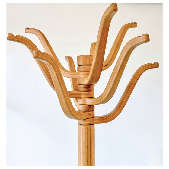 Een prachtig, speels model waar veel jassen aan opgehangen kunnen worden. Deze vintage Deense kapstok is ontworpen door Magnus Olesen en vervaardigd bij Durup in 1970. Gemaakt van massief beukenhout, is de kapstok een toonbeeld van de Scandinavische moderne filosofie: een combinatie van functionaliteit en een strak, elegant ontwerp. De vele haken zijn doordacht geplaatst om de ophangruimte te maximaliseren en tegelijkertijd een evenwichtige, visueel aantrekkelijke structuur te behouden. Het speelse maar praktische ontwerp maakt de kapstok geschikt voor entrees, kantoren of moderne interieurs die een vleugje klassiek Deens vakmanschap wensen.