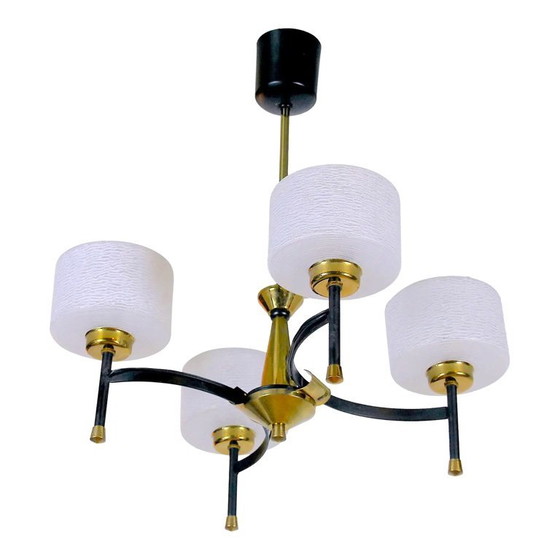 Maison Arlus, kroonluchter uit het midden van de vorige eeuw, messing en opaal, Frankrijk 1950