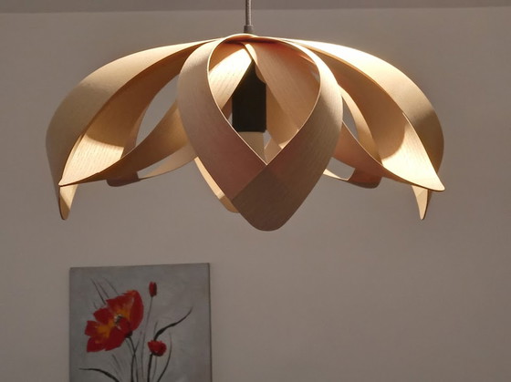 Deze lamp is gemaakt van kastanjehout met een diameter van 55 cm en een hoogte van 21 cm en is geproduceerd na 2020 en is nieuw. Hij heeft een stekkerdoos met siliconen coating E 27. In hoogte verstelbare zwarte kabel met een lengte van 80 cm. De lamp is nieuw en nooit gebruikt.