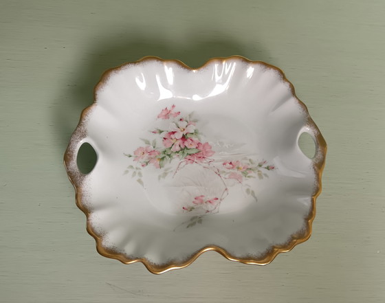 Dit vintage porseleinen ornament in bladvorm, met een handgeschilderd roze bloemmotief en een vergulde rand, is gemaakt van hard porselein dat bekend staat om zijn uitzonderlijke witheid en doorschijnendheid. Het wordt vaak een sieradendoosje of snuisterijbakje genoemd.