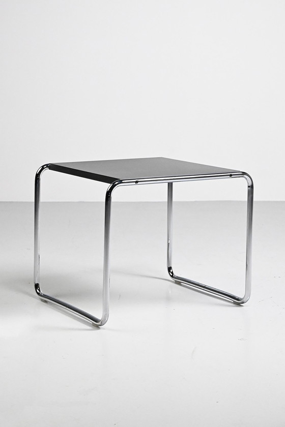 Marcel Breuer bijzettafel voor Knoll Studio. Breuer ontwierp al in 1925 deze Bauhaus klassieker. Deze Laccio bijzettafel heeft een verchroomd frame en een laminaat tafelblad en is gemerkt.Dit bijzettafeltje is in goede vintage staat.