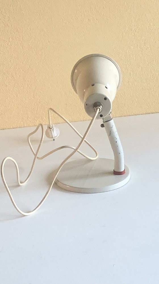 De lamp is vervaardigd uit aluminium , gietijzer, staal, en heeft een klassieke witte afwerking met subtiele rode accenten. Perfect voor liefhebbers van vintage design.