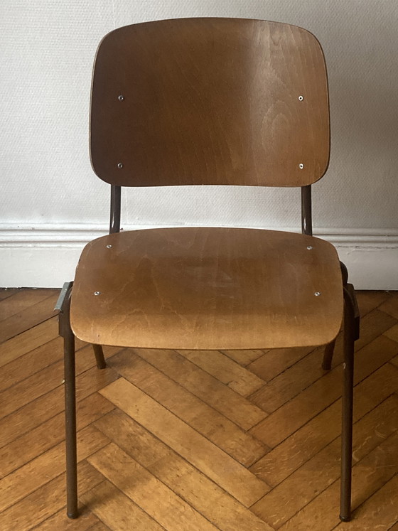 Stoelen in goede staat, stapelbaar, bredere zitting dan gemiddelde schoolstoelen waardoor ze comfortabeler zijn. Bruin metalen frame. Zitting van teakhout. 50 euro per stuk.