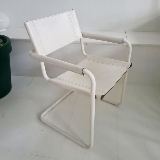 Deze zie je niet vaak. met een wit frame, design eetkamerstoel model S34 sledestoel, ontworpen door Mart Stam en vervaardigd door Linea Veam uit Italië 1980. Gemaakt van wit tuigleer met grove stiksels en wit metalen frame- epoxy De stoel is In zeer mooie conditie, Strak Geen schade Beschermdoppen aan de onderzijde Maten: B55 x H79 cm. De zithoogte is 43 cm. De diepte van de zitting is 38 cm, de diepte onderaan de `slede` is 55 cm. Leuning hoogte 62,5