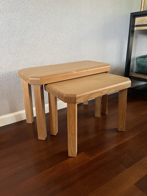 Massief eiken brutalist nesting tafeltjes vintage set 60/70