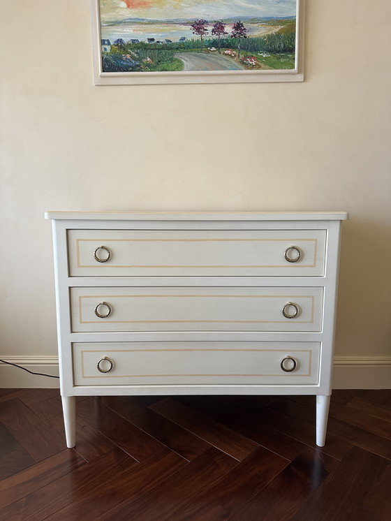 Deze massief houten ladekast is een elegante aanvulling op elk klassiek interieur. Hij is wit geschilderd met subtiele details die een vleugje verfijning toevoegen. De gouden ringgrepen maken het verfijnde ontwerp compleet. Met drie ruime lades biedt hij praktische opbergruimte voor je dagelijkse behoeften. De stevige constructie zorgt voor duurzaamheid op lange termijn, waardoor dit meubel een verstandige investering is voor je huis.
