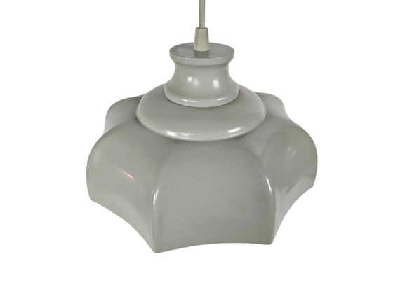 Leuke hanglamp volledig van grijsgelakt metaal in de Art Deco stijl. Voorzien van de originele plafondkap.