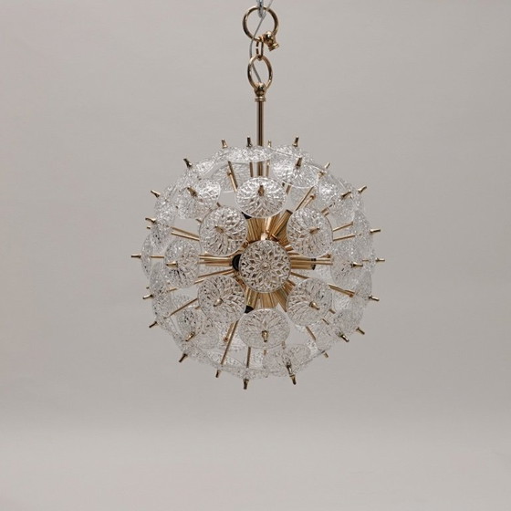 Prachtige vintage sputnik kroonluchter van het Belgische merk Massive met vergulde messing armen en centrale metalen bol.