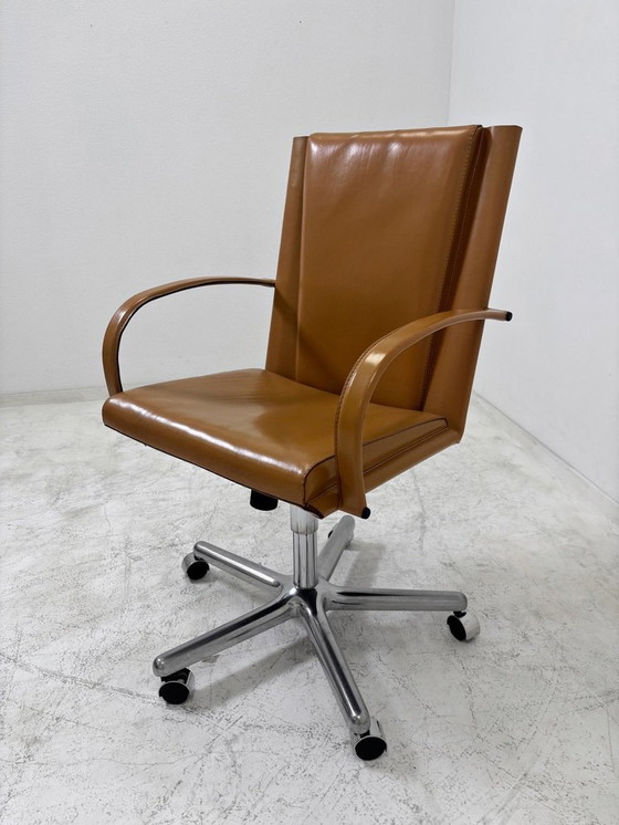 Deze elegante bureaustoel, ontworpen door Tito Agnoli voor Matteo Grassi, belichaamt de verfijning van Italiaans modern design. De stoel is bekleed met eersteklas cognac leer en combineert verfijnd vakmanschap met tijdloze functionaliteit. De slanke armleuningen, ondersteunende hoge rugleuning en gepolijste aluminium draaivoet met wielen maken hem ideaal voor zowel directiekantoren als stijlvolle werkplekken thuis.