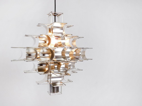 Dit originele model werd in de jaren 70 gemaakt en heeft een metalen frame versierd met aluminium lamellen. Dit weerspiegelt Sauze's kenmerkende werk met metaal, draadconstructies en aluminium perfect.