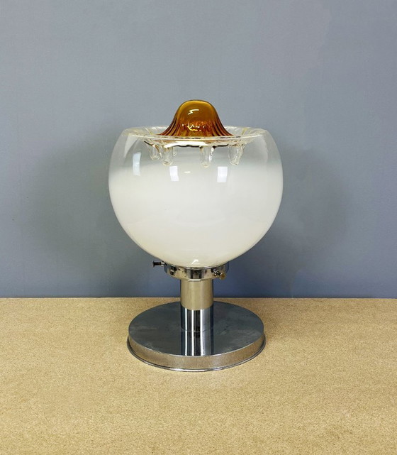 Grote tafellamp, toegeschreven aan Mazzega. Het opaalkleurige glas is tot in de puntjes perfect. Het chromen frame vertoont ouderdoms- en gebruikssporen. In perfecte staat.