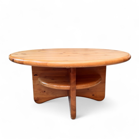 Mid Century Modern Scandinavisch design salontafel massief grenen. Met opbergruimte. In de stijl van Rainer Daumiller. D105cm H 51cm Goede originele vintage staat. Lichte vlekken, deukjes, krassen, in verhouding met leeftijd en gebruik (zie foto's).