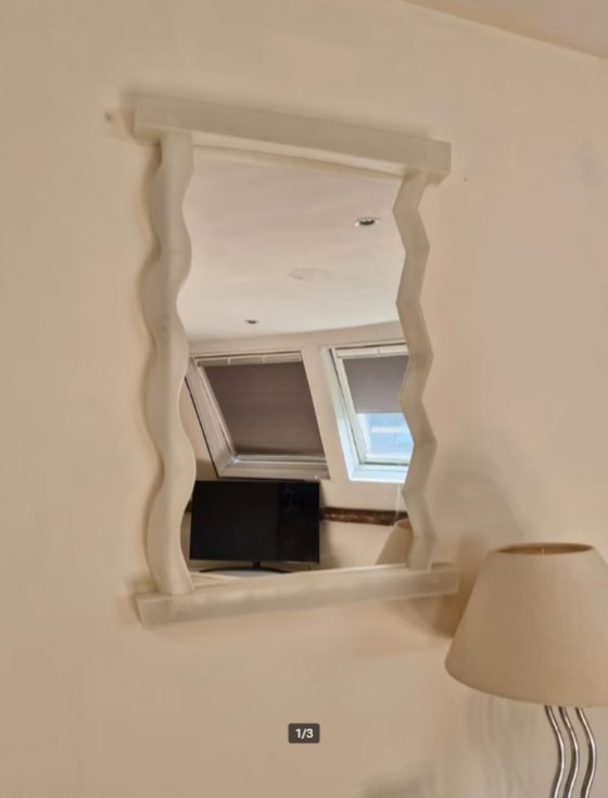 Dit is een unieke IKEA designspiegel uit de jaren 90, met een transparante kunststof lijst met een golvend patroon. De spiegel is een perfect statement piece voor elke kamer en voegt een vleugje retro toe. De levendige kleur en het opvallende memphis design maken hem een verzamelobject voor fans van vintage IKEA-producten.