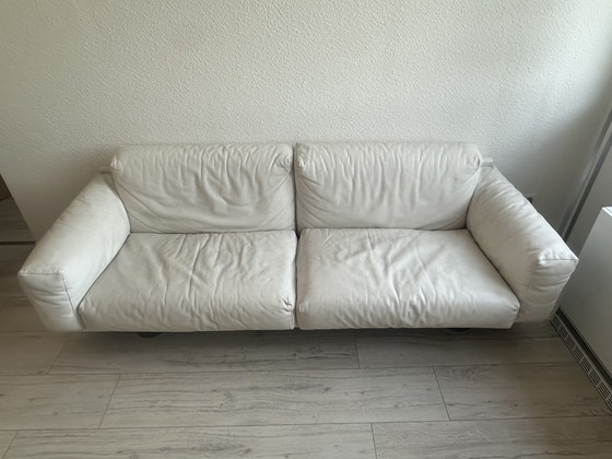 Tijdloze witte leren bank; ontworpen door Afra en Tobia Scarpa voor Meritalia, Italië, 1980. De foto's laten duidelijk zien dat de constructie uit één stuk bestaat, een combinatie van staal en hout. Het dienblad is uit één stuk gegoten. De bank is bekleed met hoogwaardig wit leer. De geweven zitting is, zelfs na jarenlang gebruik, nog steeds even soepel.
