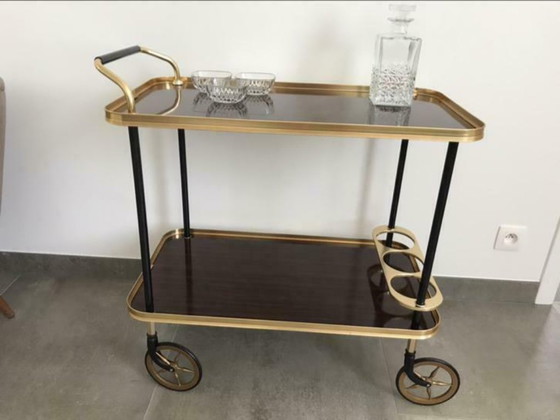 Dienwagen in sobere Italiaanse stijl - messing elementen en formica dienblad met houtprint - voor het serveren van drankjes of het presenteren van decoratieve items. Uitgerust met stevige wielen.