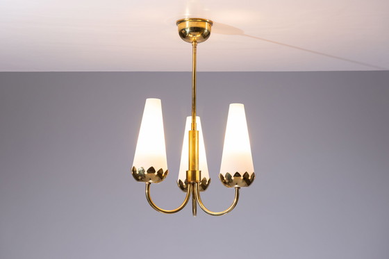 Messing kroonluchter met prachtige melkglazen lampenkappen. Ontwerper onbekend, mogelijk gemaakt in Zweden, jaren 1960 Gemaakt van messing en melkglazen lampenkappen Afmetingen B 30 D 30 H 50 cm