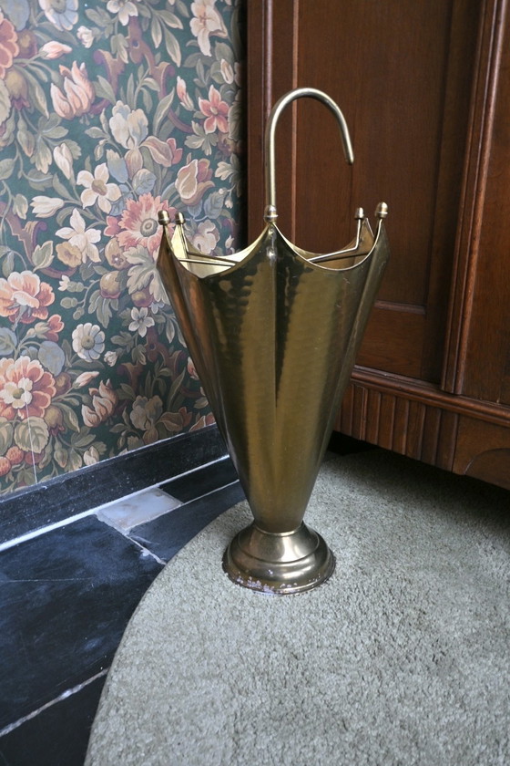 Er zit en messing paraplubak in de vorm van een paraplustandaard, vermoedelijk in de jaren '50, gemaakt in Duitsland. Een bijzonder pronkstuk voor in huis!