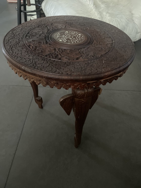 Dit is een prachtig met de hand gesneden bijzettafel of wijntafel, perfect om een vleugje elegantie toe te voegen aan elke kamer. Het is gemaakt van rijk bruin hout en heeft ingewikkeld houtsnijwerk en een uniek ontwerp dat bekwaam vakmanschap laat zien. Ideaal voor gebruik als decoratief stuk of functionele tafel, het is een aanvulling op een verscheidenheid aan interieurstijlen, vooral die met een bohemien flair.