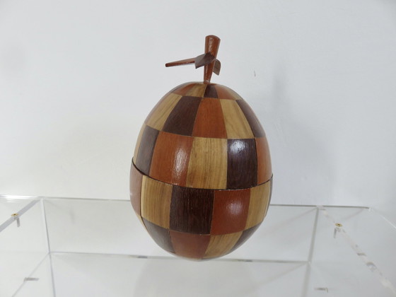 Ijsemmer, ijsblokjesbakje, kokosnoot bedekt met marqueterie van verschillende houtsoorten. Handgemaakt in de jaren 70. Kan worden gebruikt als ijsemmer of als een ongewoon en zeer origineel decoratief object. Hoogte 28cm. Spanwijdte 19cm. In uitstekende staat.