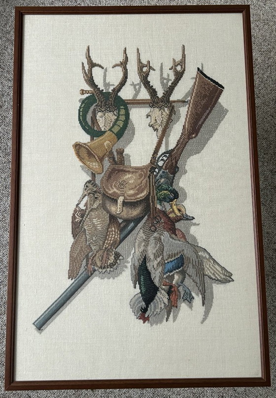 Image 1 of Met glas ingelijst borduurwerk met jachttafereel