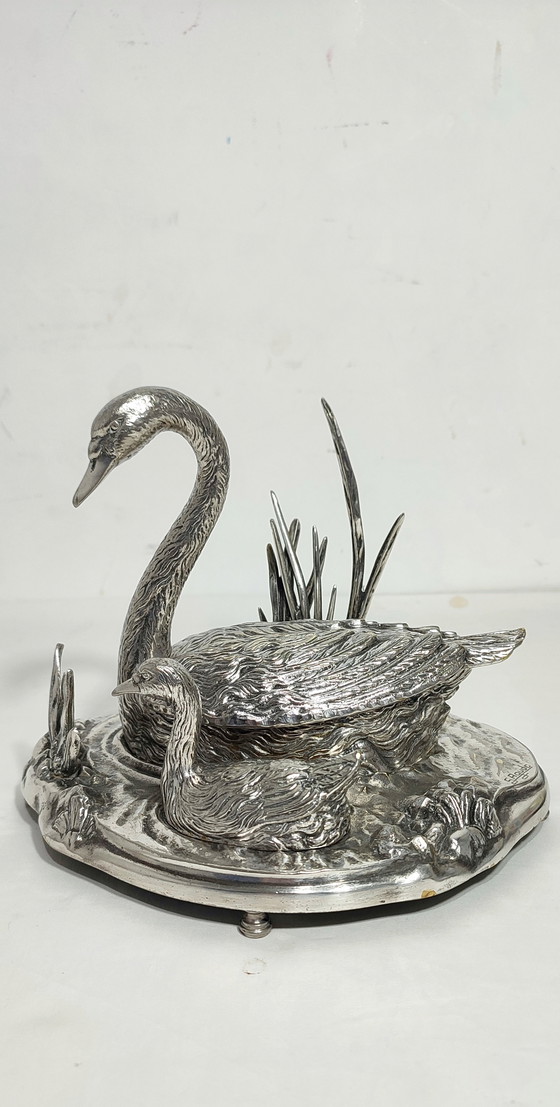 Metalen asbak met een afbeelding van een zwaan en zijn kroost in een vijver met riet. De vleugels van de zwaan dienen als asbak en in het lichaam van de nakomeling zit een luciferdoosje met een plek voor schuurpapier.