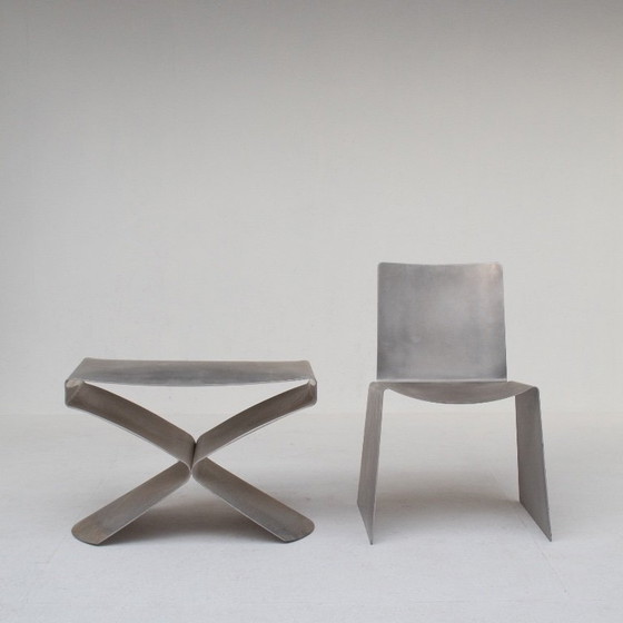 Deze set van Xavier Lust bestaat uit een sculpturale metalen stoel en een bijpassende bijzettafel, beide gekenmerkt door een sterk gevoel van balans en ingetogenheid. Elk stuk is vervaardigd uit één enkele plaat gevouwen staal, wat resulteert in een helder, architectonisch silhouet zonder overbodige elementen.