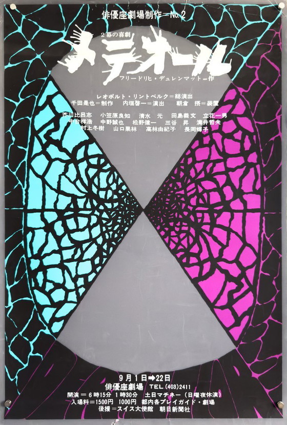 Opvallende originele Japanse poster voor de 1980 productie van "Meteor" (メテオール) van Friedrich Dürrenmatt, opgevoerd in het befaamde Haiyuza Theater in Tokio. Met zijn gebroken geometrische lay-out, grimmige typografie en levendig kleurgebruik weerspiegelt de poster het existentiële onbehagen en de visuele fragmentatie die centraal staan in het werk van Dürrenmatt.
