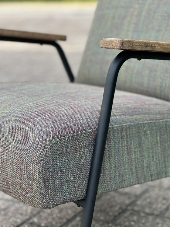 Ontdek de Meurop "Reclame" stoel, een vintage meesterwerk dat stijl en comfort combineert. Het slanke metalen frame en de houten armleuningen zorgen voor een tijdloze uitstraling, terwijl de groen-bruine textielbekleding een vleugje elegantie toevoegt. Perfect voor elke woonruimte, deze stoel is zowel functioneel als esthetisch aantrekkelijk. Omarm de charme van vintage design met dit prachtige meubelstuk. Volledig onderzocht en gestoffeerd in eigen atelier