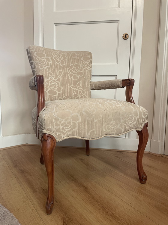 - De bekleding is voorzien van een subtiel bloemenpatroon in een rustgevende beige tint, wat een vleugje tijdloze charme toevoegt.