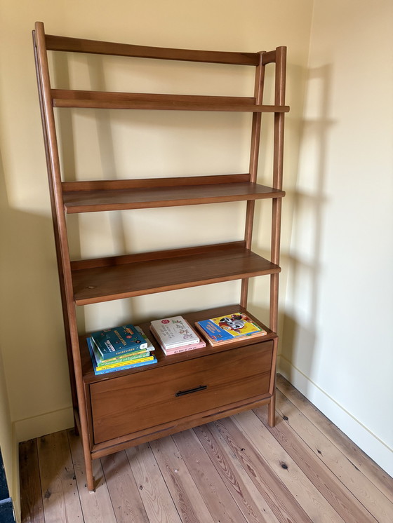 Eerste eigenaar, aangekocht in 2018 bij West Elm. ‘Kiln-dried solid eucalyptus wood frame and legs; engineered wood sides covered in an acacia wood veneer.’ Gemaakt uit FSC®-certified hout. 3 vaste schabben. Lade met zachte gelijder. Lade kan dienst doen voor klasseersysteem. 97 cm w x 38 cm d x 178 cm h